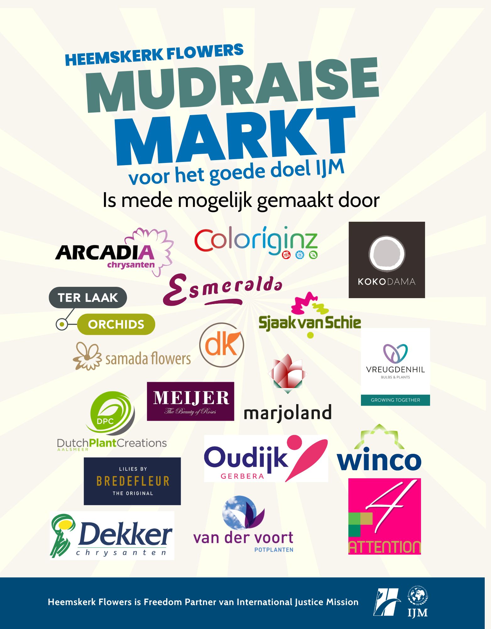 Sixteen of our employees will participate as a Heemskerk Flowers team in the MudRaise of MudMasters on Saturday 8 June. This is an obstacle run as well as a fundraising challenge. By participating in this obstacle run, we are fighting together with IJM against injustice, human trafficking, abuse and slavery.