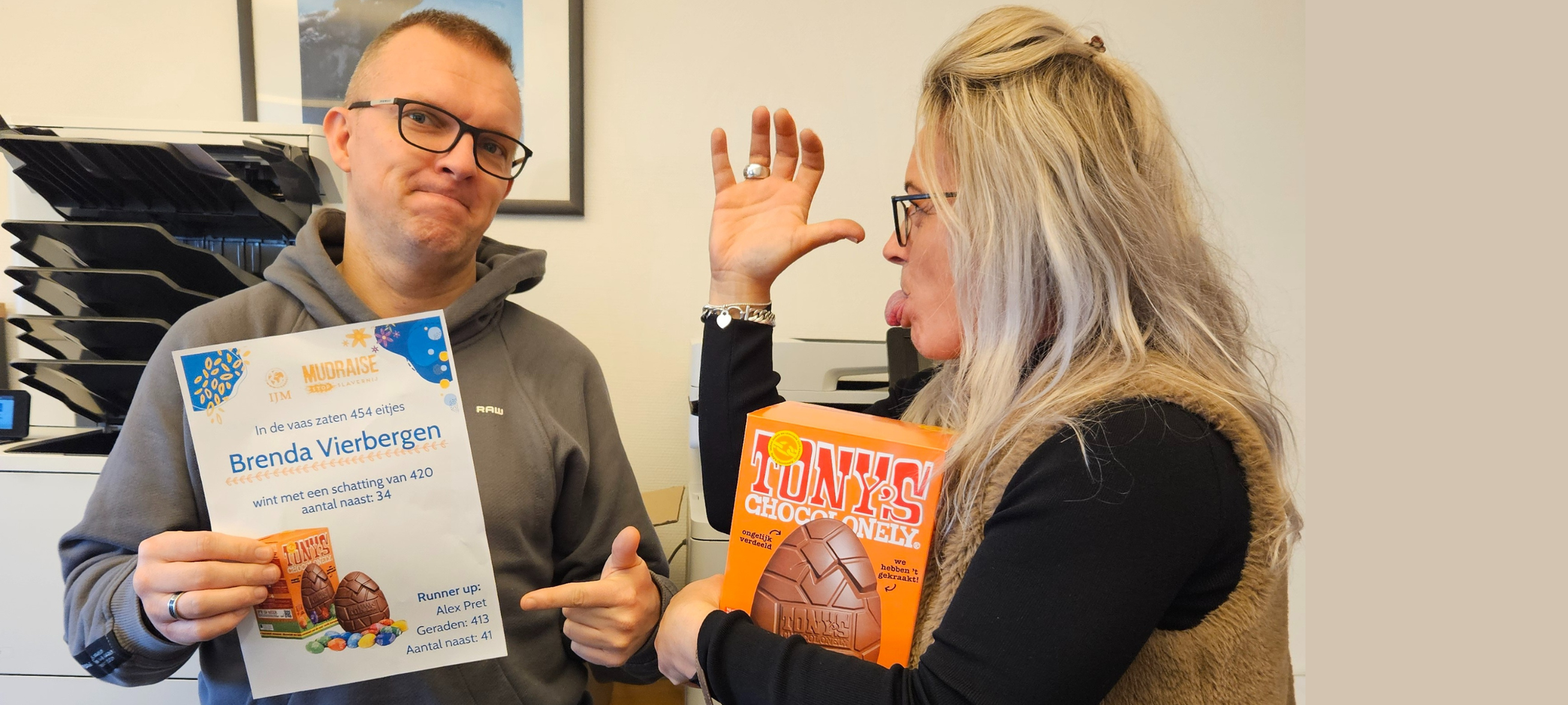 Guess & Win an Easter egg There was a vase of Easter eggs in the canteen for our employees. If you donated an amount, you could take part in the Guess & Win Easter action. The person who came closest to the correct number won a big Tony's Chocolonely Easter egg. Brenda won the big egg. Colleague Alex was disappointed, as he came second, winning nothing.